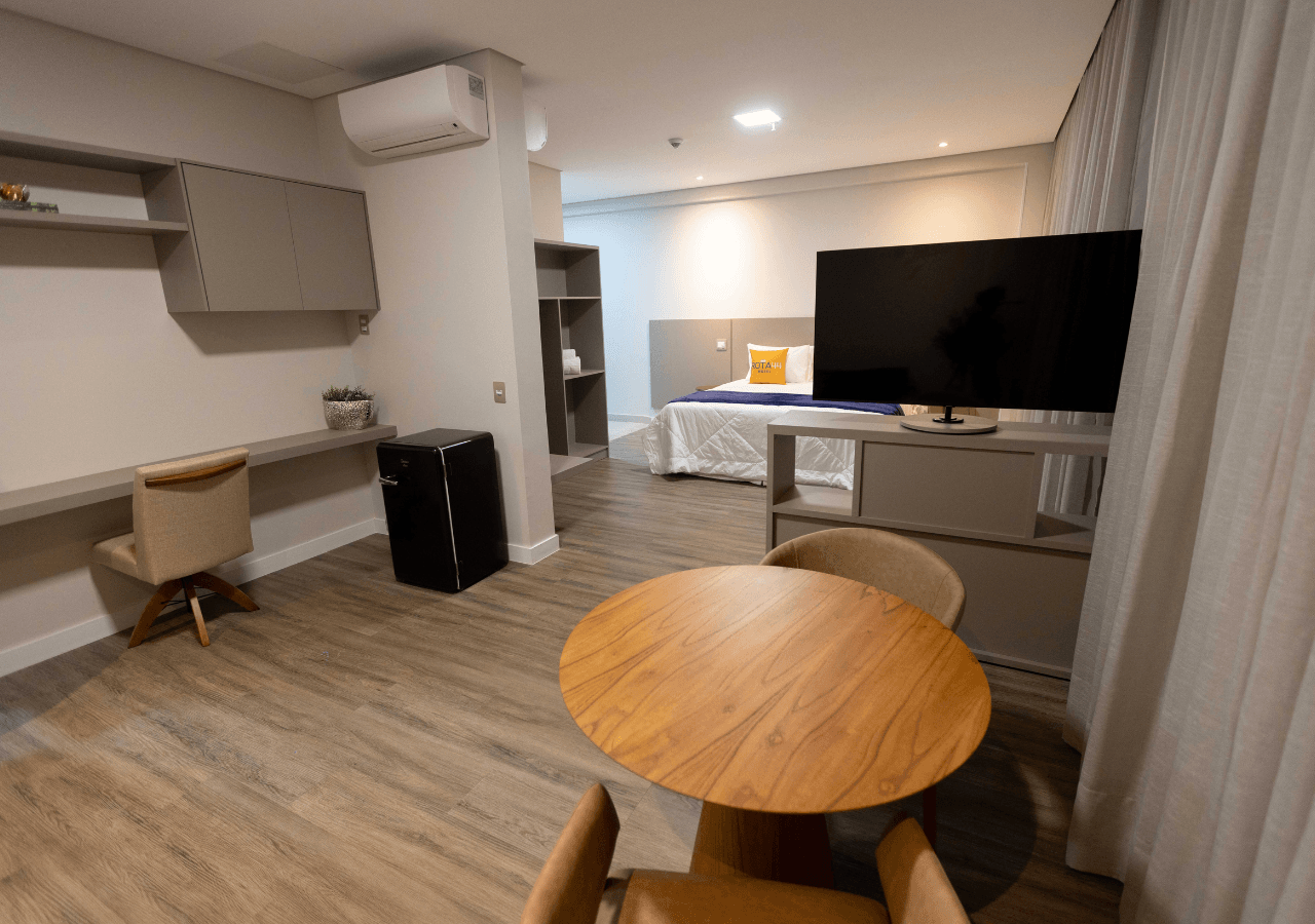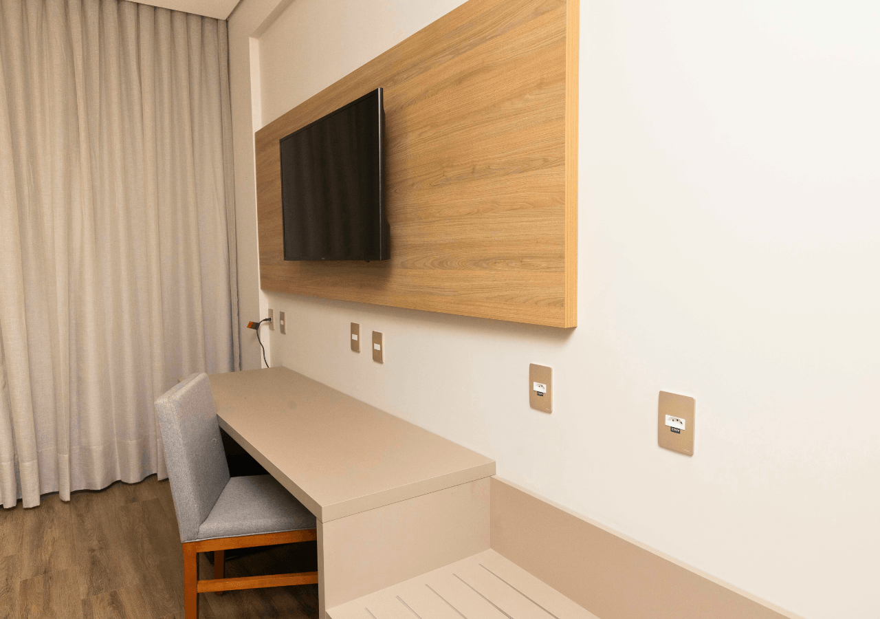 Até 26m² com cama queen-size ou solteiro, ar-condicionado split, Smart TV 43”, estação de trabalho, internet Wi-fi, frigobar, maleiro, armário com cabides, espelho e ducha, secador de cabelo e amenities (shampoo 2x1 e sabonete).